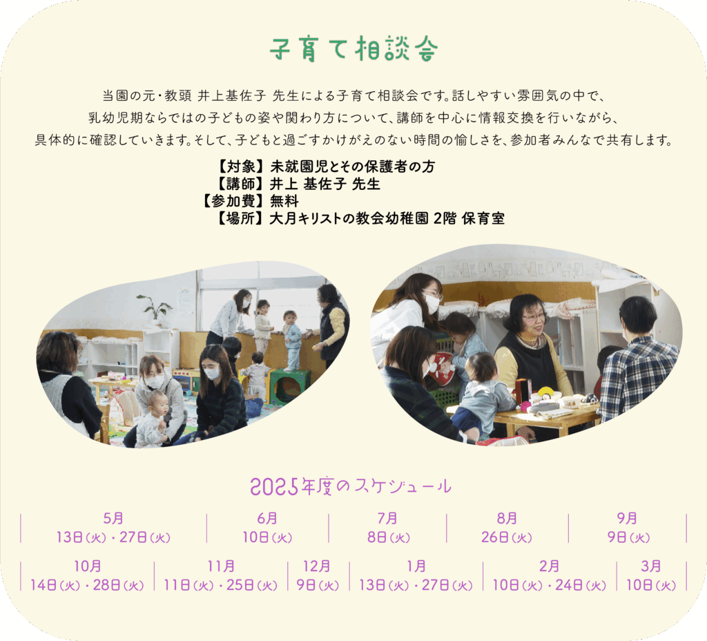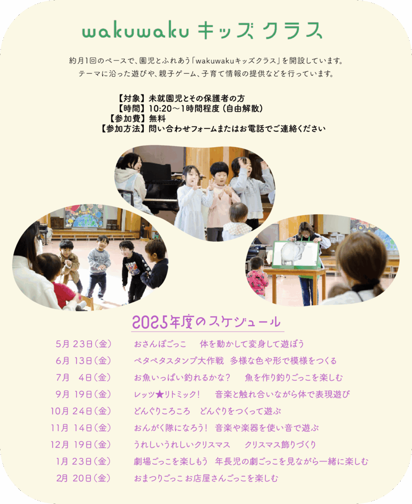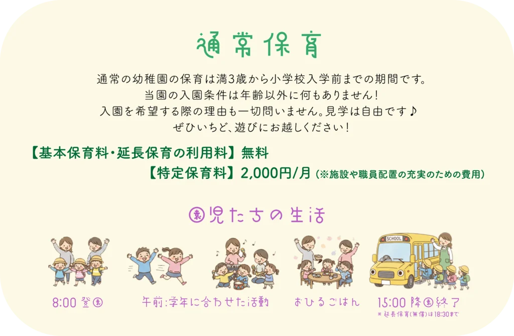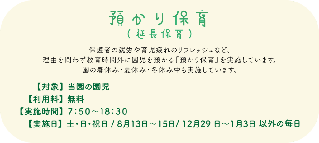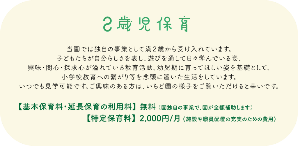 当園は満2歳〜就学前までの園児向け保育プログラムと未就園児向けのプログラムを提供しています。 入園に関するよくある質問はこちら 当園では、未就園のお子さんとその保護者向けに子育て支援のプログラムを開催しています。参加費不要でどなたでも参加できますので、お気軽にお申込みください♪