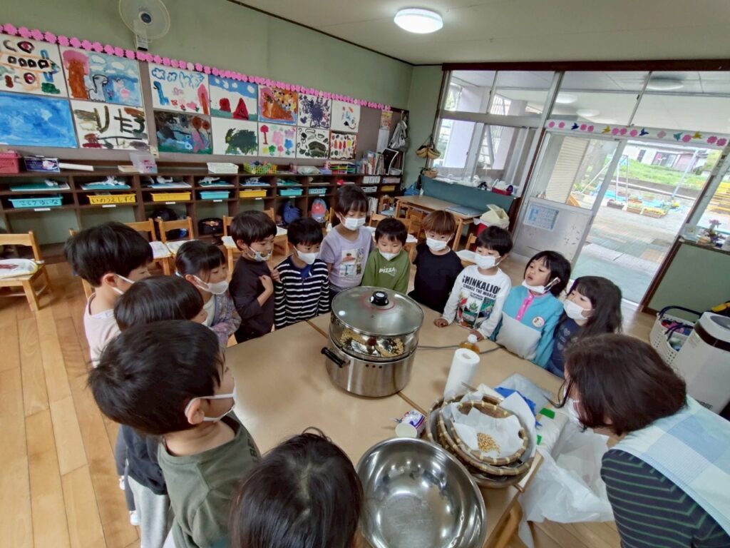 大きいクラスの友達が、ポップコーン作りを楽しみました。