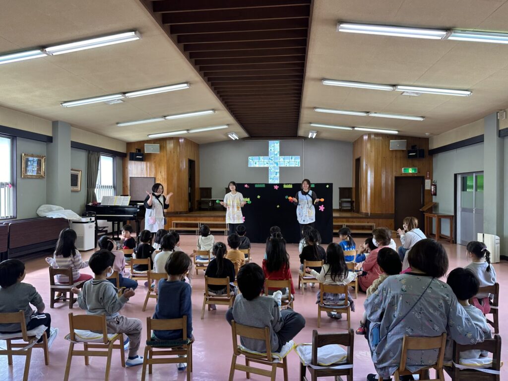 2階の広場に集まって、先生たちの人形劇を見たり、楽器を使って音楽で楽しみました。みんなで集まる楽しさ、話を聞く楽しさ、自分を表現することの喜びなど、たくさん積み重ねていきたいと思います。