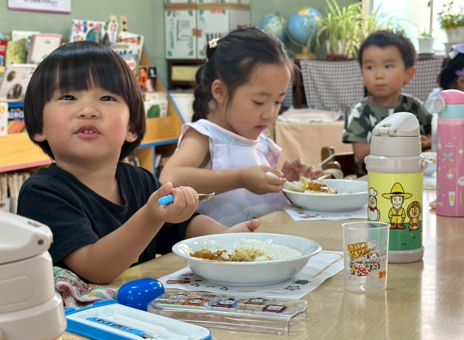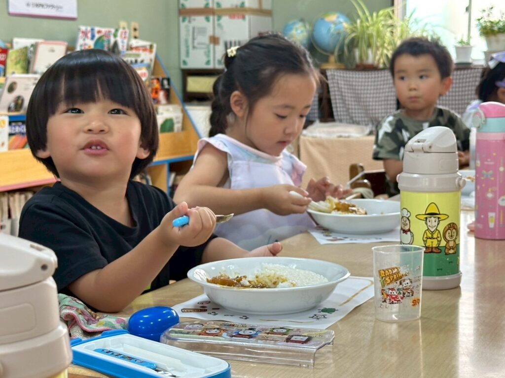 カレーはとても美味しくて、何度もおかわりする子もいるほど。年長・年中さんの子どもたちは、自分たちで作り上げた喜びや、小さいクラスの子に「おいしい!」と言ってもらえるうれしさを感じていました。