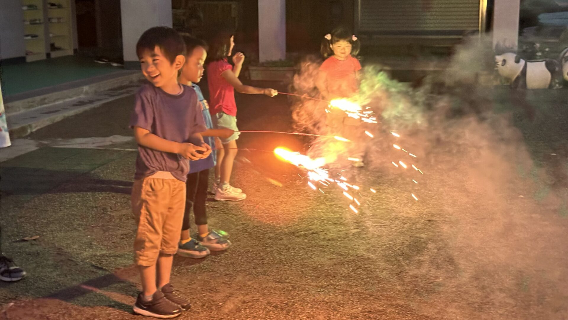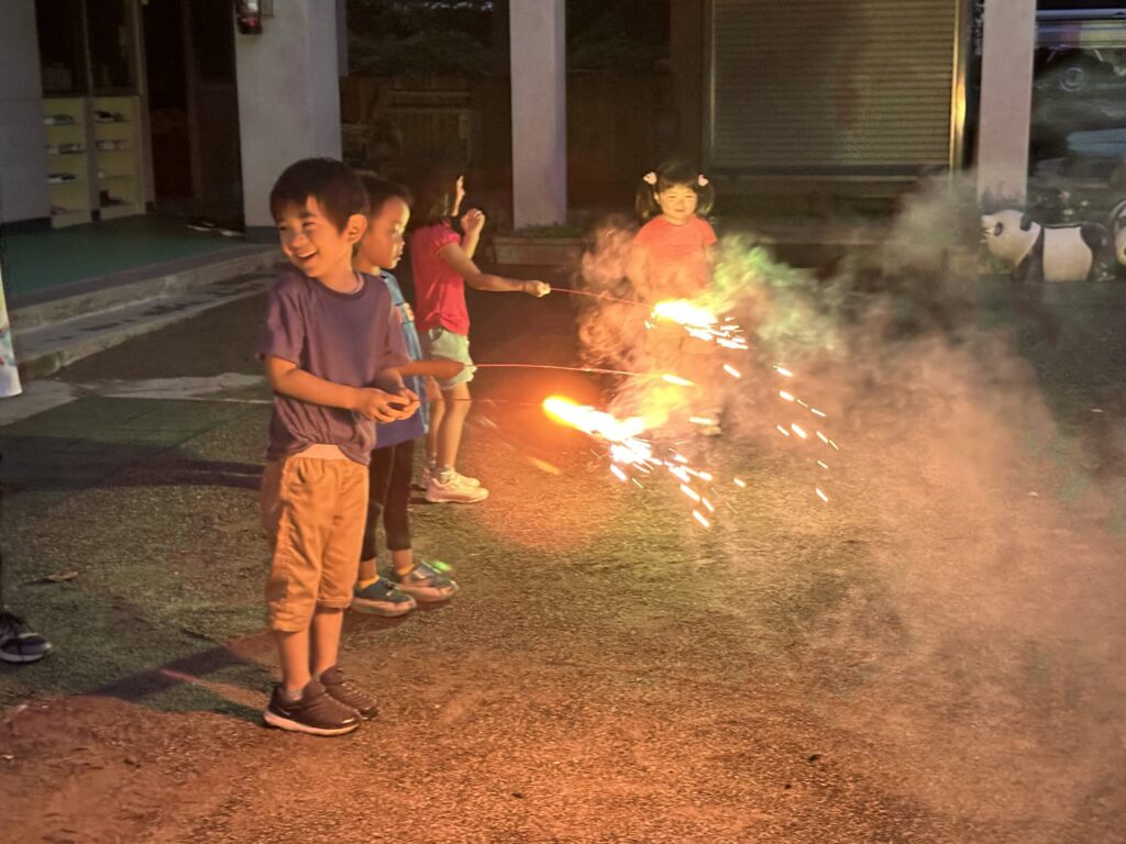 お楽しみ会② 2026.01.28 幼稚園日記 美味しいカレーを味わい、いつもとは違う夜の園内探検を楽しんだあとは、お待ちかねの花火タイム。手持ち花火や打ち上げ花火に大喜びし、夏休みの最後を飾る特別な一日となりました。友達と心ゆくまで楽しんだこの経験は、きっとこれから始まる2学期の生活につながっていくことでしょう。新しい学期が今からとても楽しみです。