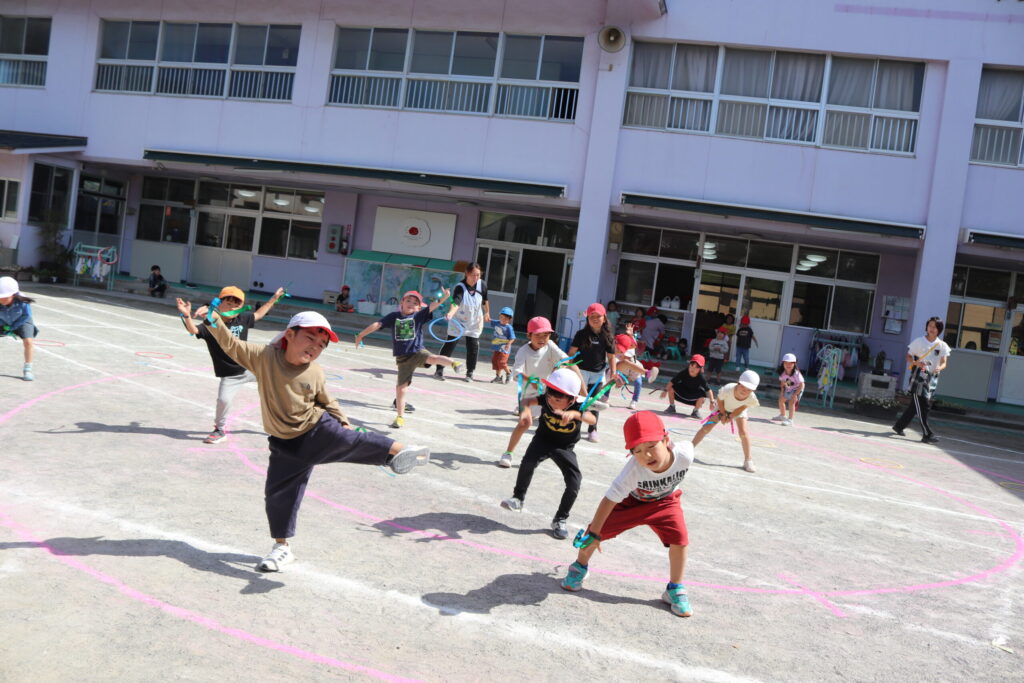 ・跳び箱などに挑戦した後、みんな、お友達の所に走っていき、ハイタッチしたりハグをしたり、、、。一緒に喜び合う様子がとても温かくキリスト幼稚園ならではだなぁと見ていて嬉しくなりました。表現の恐竜や妖精になりきる子どもたちがとても生き生きしていて楽しそうでした。自分たちで選んで考えて、それを先生方がたくさん受け止めてくれて、できあがったのだろうなぁと感じました。子どもたちの笑顔がキラキラと光るすてきな運動遊びの会、本当にありがとうございました。