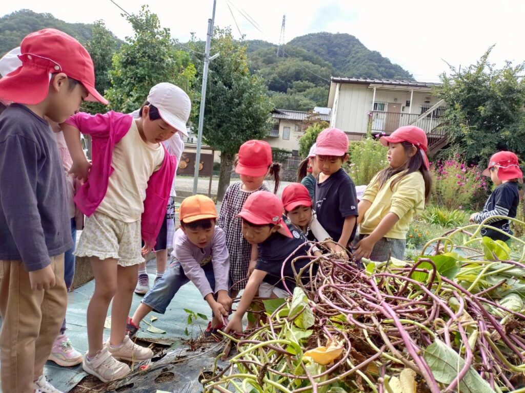 サツマイモの収獲① 2026.01.28 幼稚園日記 6月の初めに植えたサツマイモの苗がぐんぐん大きくなり、いよいよ収穫の時を迎えました。みんなでツルをしっかり握って力いっぱい引っぱります。自分たちで植えたサツマイモがどれくらい大きくなっているのか、どんな形をしているのかを想像しながら、ワクワクした気持ちで掘り進めました。「大きいのが出てきた!」「これで焼きいもしたいね!」と、子どもたちの歓声が園庭に広がりました。