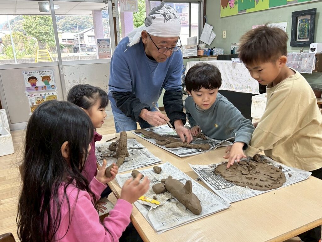 これから、乾燥~素焼き~釉薬~本焼きと、時間をかけて完成へと向かっていきます。素材の変化にも興味をもちながら、完成の日を心待ちにしている子どもたちです。