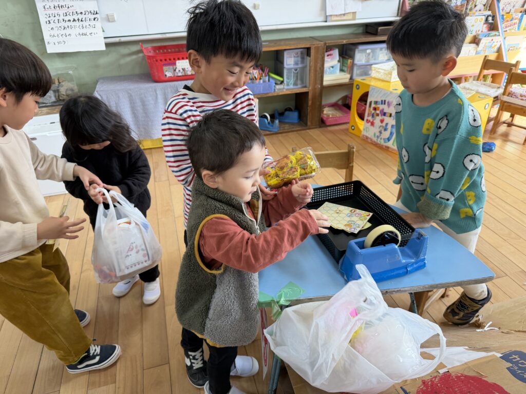 wakuwakuキッズクラスの小さなお友だちに続いて、今度は幼稚園の小さいお友だちにも「おまつりごっこ」を楽しませてくれた年長さん。