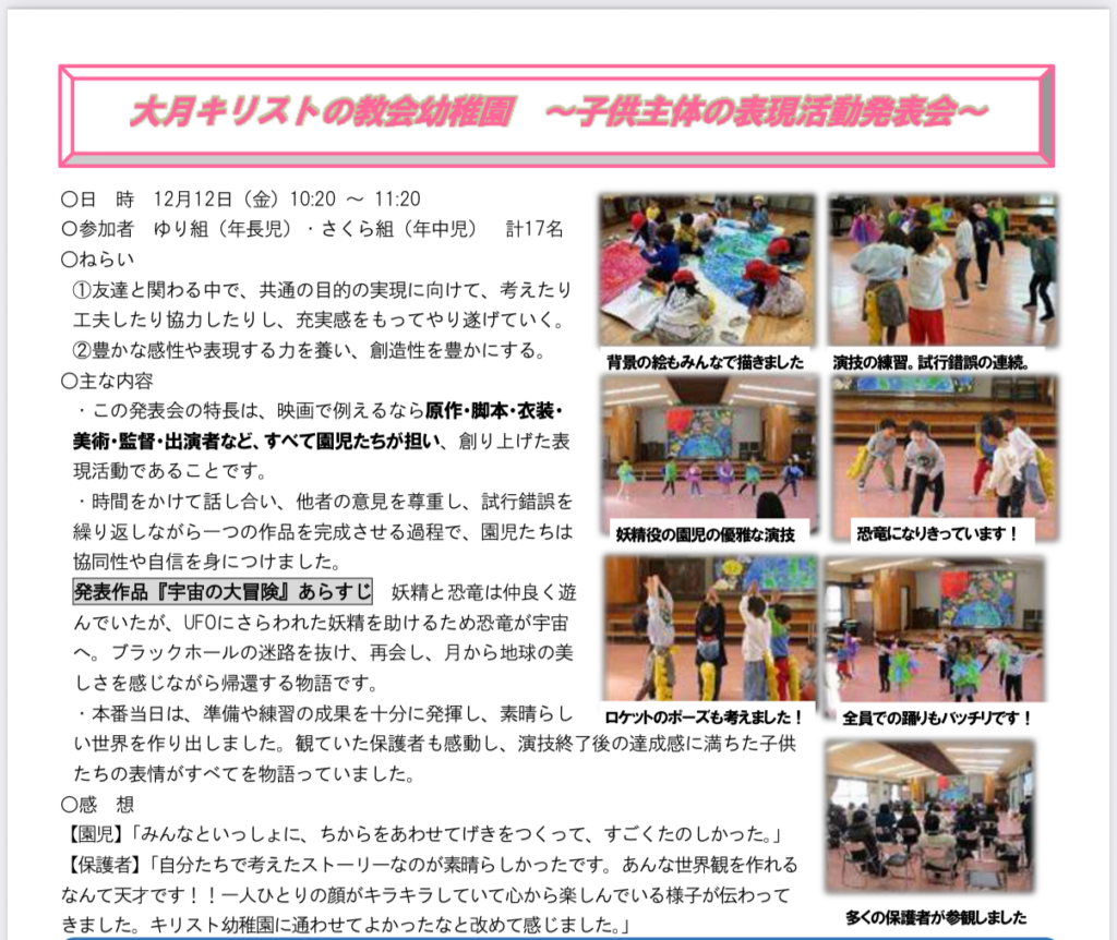 大月キリストの教会幼稚園の取り組みが情報誌に掲載されましたので、抜粋してご紹介いたします。本誌は、市町村長、市町村(組合)教育委員会、保育所(園)・認定こども園・幼稚園、小学校・中学校・高等学校・支援学校・大学、地域教育推進連絡協議会構成団体などへ配付され、教育に携わる多くの方々に広く親しまれている情報誌です。保育の歩みや、子どもたちが日々の生活の中で見せてくれる豊かな育ちの姿を、このような形で多くの方に知っていただけることを大変嬉しく思います。子どもたち一人ひとりの小さな発見や喜び、友だちと関わる中で育まれていく優しい心、そうした日々の積み重ねこそが、幼児教育には必須です。これからも、子どもたちの「今」を大切にしながら、温かなまなざしで成長を見守っていきたいと思います。