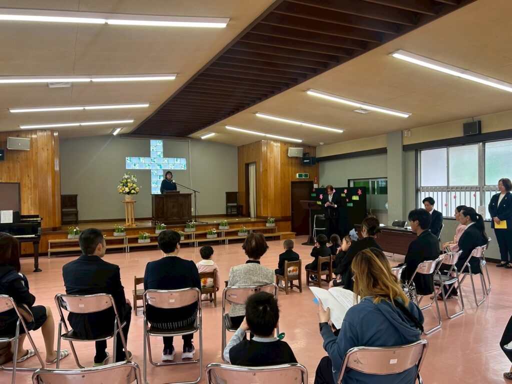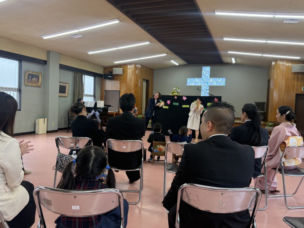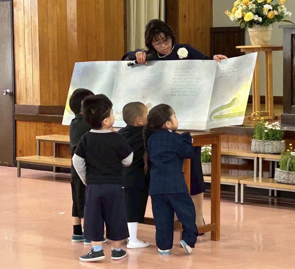第75回入園式が行われました。 2026.04.07 幼稚園日記 暖かな春の日差しとともに、新しい年度が始まりました。和やかな雰囲気の中で、新入園児・進級児を迎え、元気な子どもたちと一緒に入園式を行うことができ、嬉しく思っております。これから一人ひとりと丁寧に向き合い、かけがえのない日々のひとときを大切に見守っていきたいと思います。 先生たちが人形劇や楽器を使いみんなで歌を楽しみました。