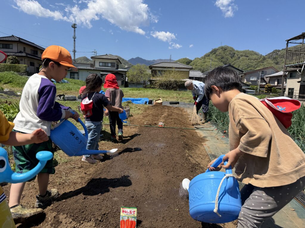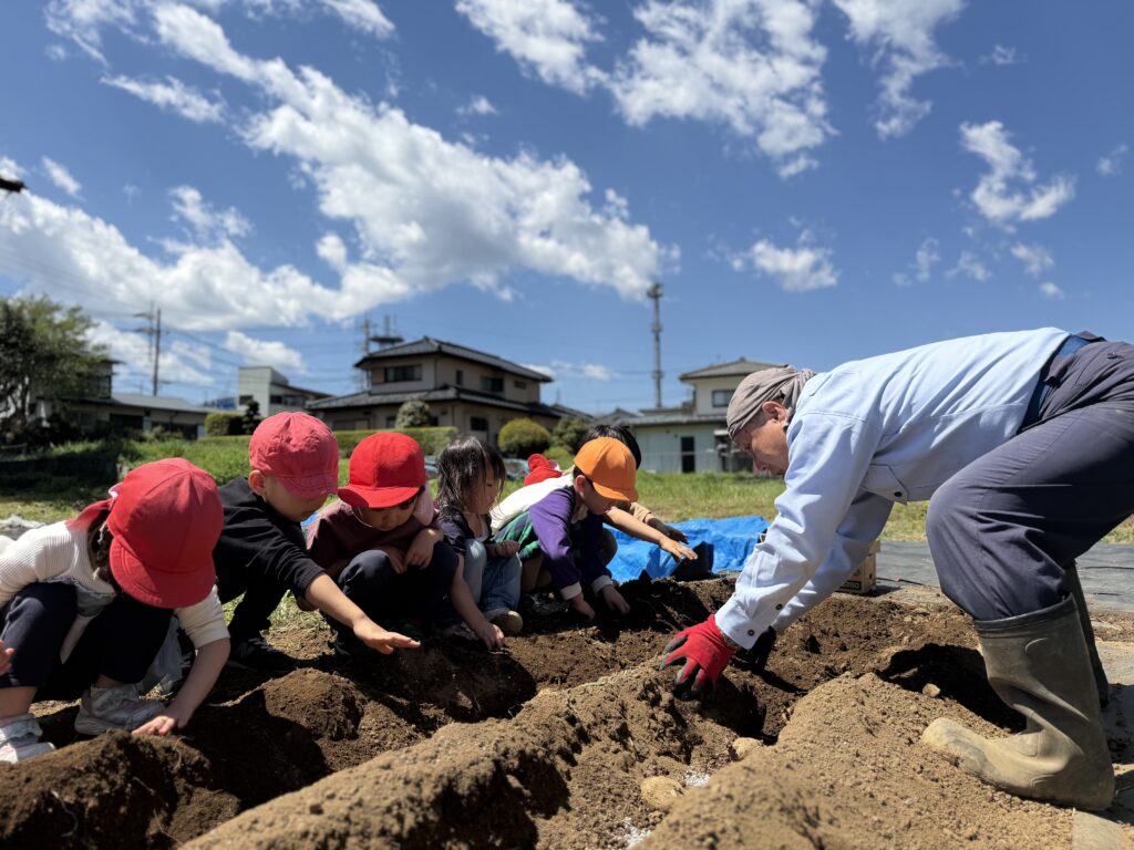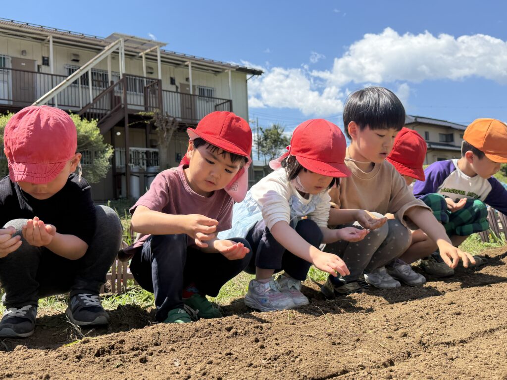 小さな種から大きなニンジンが育つことや、土の中でジャガイモが育っていく様子は、子どもたちにとってまだ想像することが難しいようですが、その不思議さに出会うことが、かけがえのない経験となっています。これからどのように芽を出し、少しずつ成長していくのか、その変化に心を寄せながら、子どもたちと共に見守っていく日々を楽しみにしています。